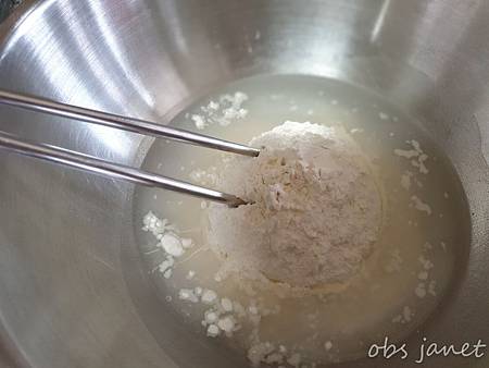 倒掉麵盆裡的水,用筷子攪出麵糰的筋性。