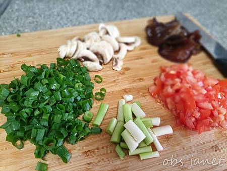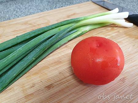 麵糊準備好,可以開始切菜了,將蔥與番茄洗好備用。