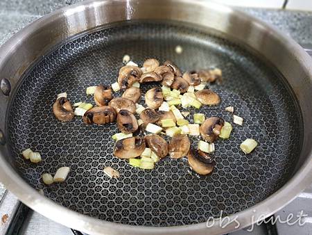 熱鍋將蘑菇炒香,加蔥白炒至焦香。