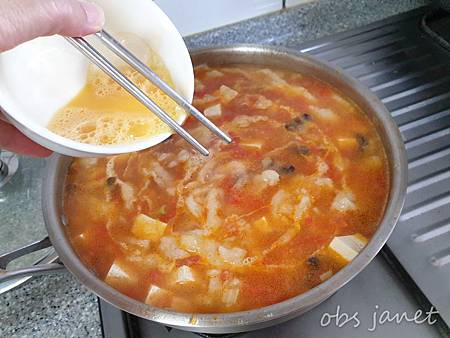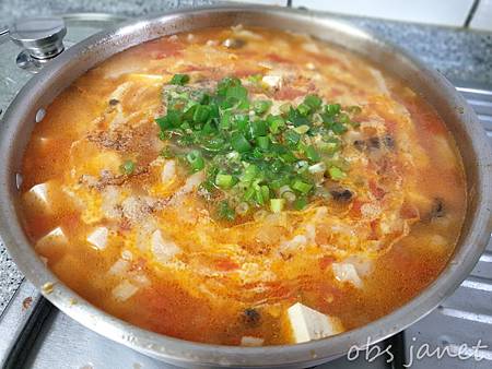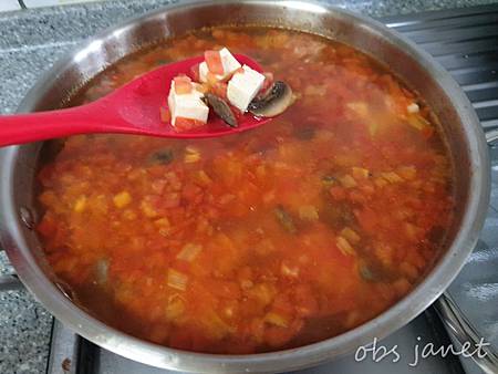加水和豆腐煮約10分鐘,讓番茄的營養盡量融入湯裡。