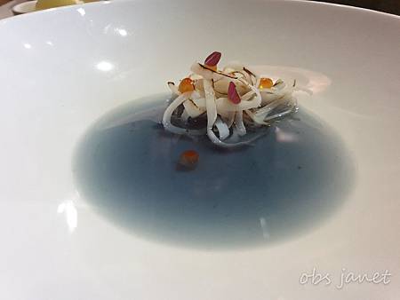 這道湯品是紫高麗菜汁搭配炙燒透抽與鮭魚卵,蠻清淡的。