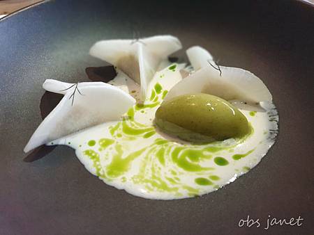 水餃皮是用醋醃過的白蘿蔔片,裡面包了蟹肉和花枝,水餃上面小小的生菜裝飾似乎是用針線把水餃縫合起來,挺別緻的,白蘿蔔水餃搭配了奇異果冰淇淋,很清新!