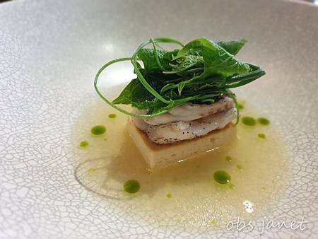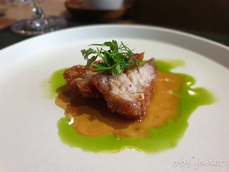 第一次品嘗到這食材,義式或法式料理的高級內臟食材之一:牛胸腺,搭配了九層塔汁。