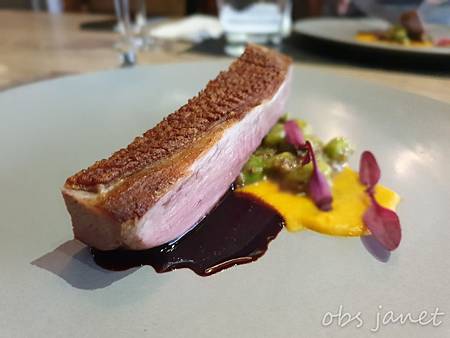 終於上主菜了,是櫻桃鴨胸排,搭配了紅蘿蔔泥,旁邊點綴的牛血葉口感不錯,葉子小小的,很可愛。