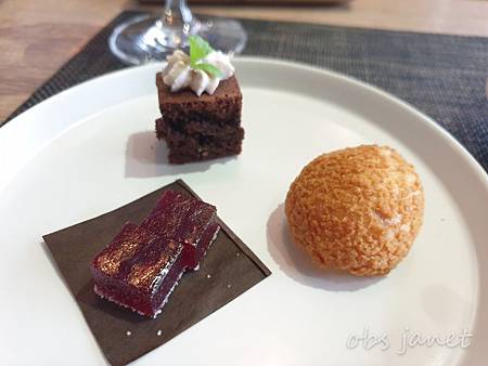 我發現他們好懂顧客的食量和對甜點的欲望,甜點香甜可口,可是衣帶漸緊,所以第三道甜點是三種小巧的組合:覆盆子軟糖、巧克力布朗尼搭香蕉奶油、還有榛果泡芙。
