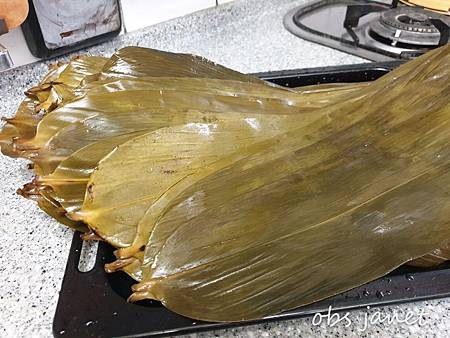 包粽前一天晚上先處理粽葉,水沒過竹葉,加一大匙油,沾了油的竹葉比較不會黏米粒。