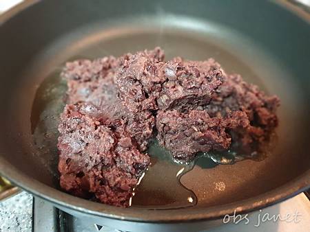 蜜紅豆再處理,做成紅豆沙,鍋裡先放油,奶油也可以。
