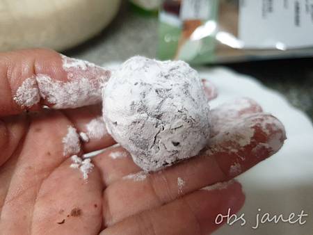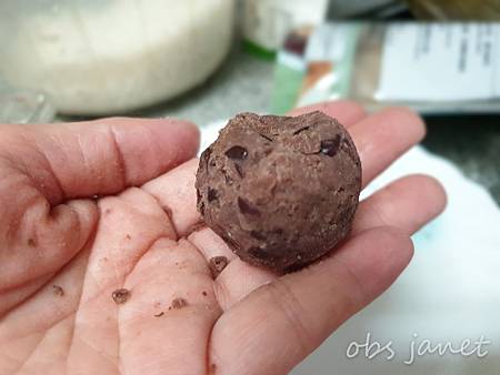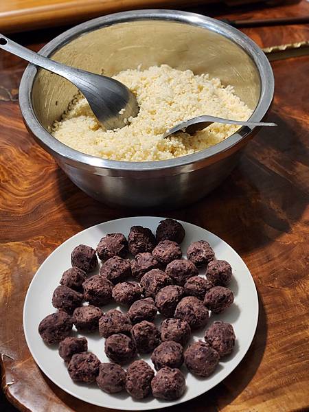 擔心紅豆餡沒辦法搓成團,有老師建議紅豆丸子外面滾糯米粉,我沒有糯米粉,準備了在來米粉(應該效果差不多吧?)