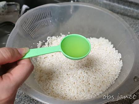 鹼粽要有鹼味,但又不能加太多,我準備了一斤圓糯米,粳油的量比建議的少一點,不足一匙。