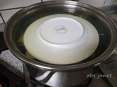 粽子若浮出水面,沒泡到水,米粒可能不熟,所以放一個盤子壓著,確保所有的粽子都泡在水裡。