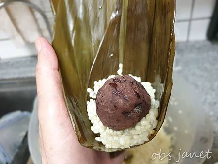 在紅豆丸周圍補滿糯米,這樣煮好時紅豆才會在鹼粽的正中央。