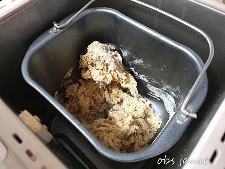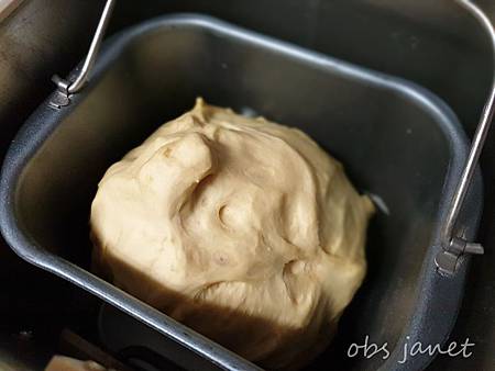 先做麵糰:200公克高筋麵粉,20公克糖,2公克酵母粉,2顆蛋,加入麵包機攪拌。
