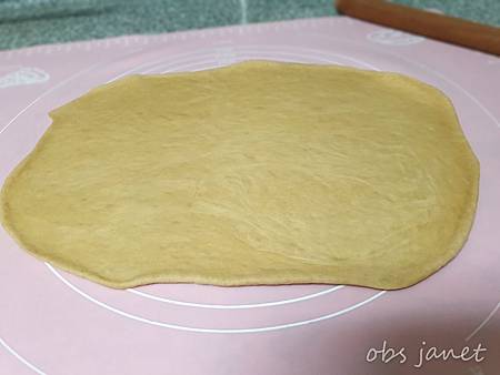麵團搓揉大約15分鐘後用擀麵棍擀成約0.5公分厚。