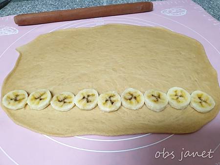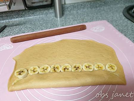 香蕉切薄片後排在麵皮上。