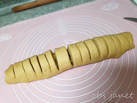 用刀在麵糰上劃幾刀,不要切斷。