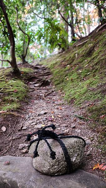在瑠璃庭園小徑的路口發現綁帶的石頭,溫馨、有趣、與自然環境完全無違和感,這可比『禁止入內』的標示牌有創意,而且更有效吧!