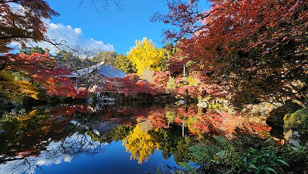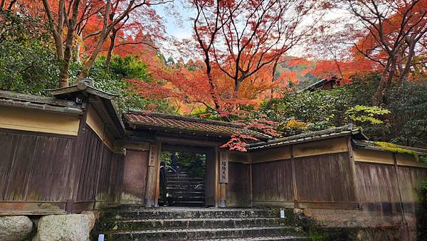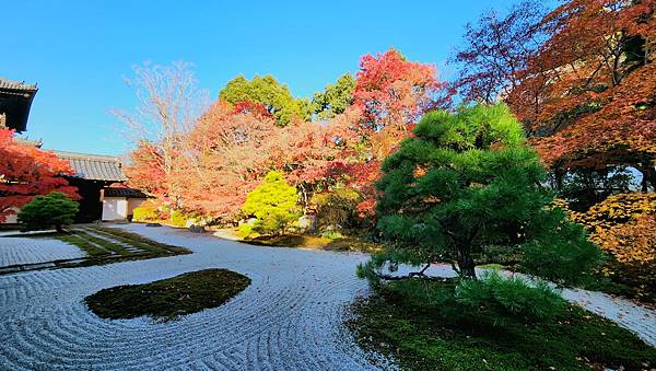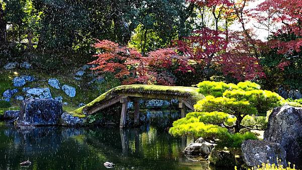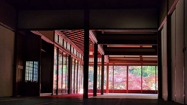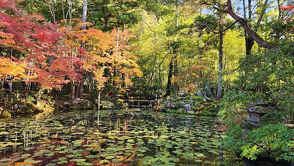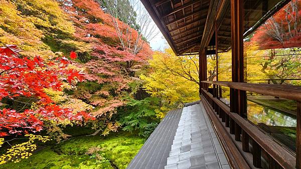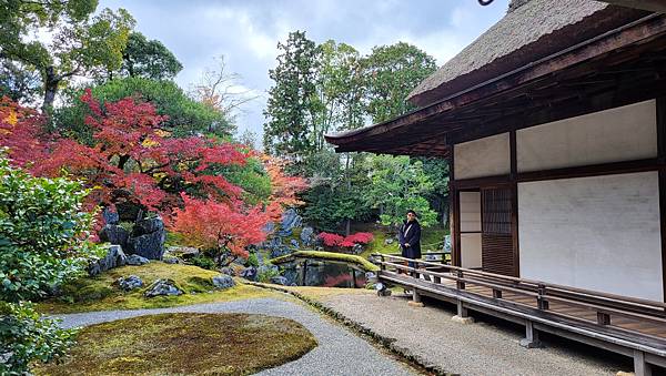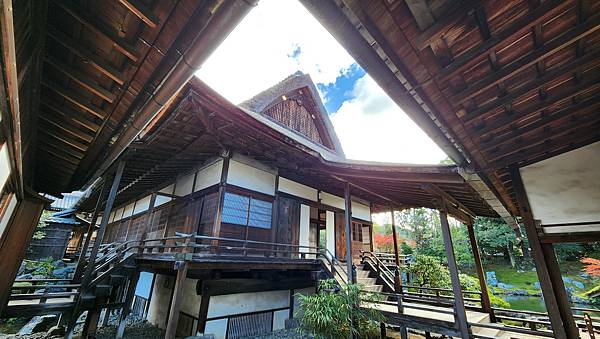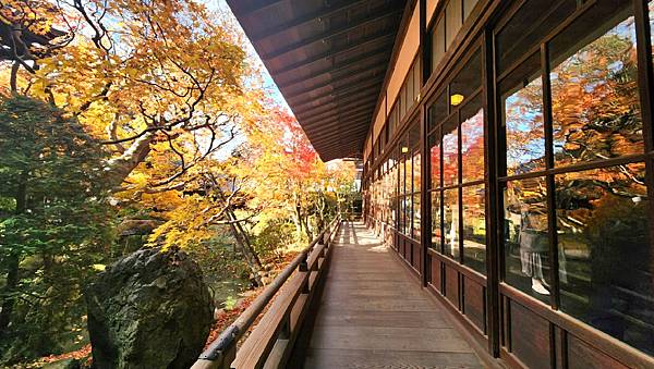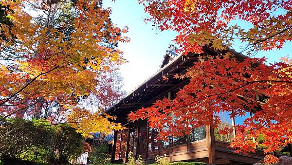 院中的日式傳統古樸建築在庭園中各種層次的紅、黃、綠葉映襯下,彷彿一靈動的大自然調色盤。
