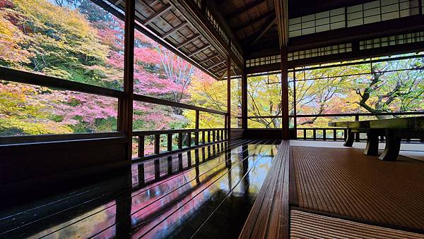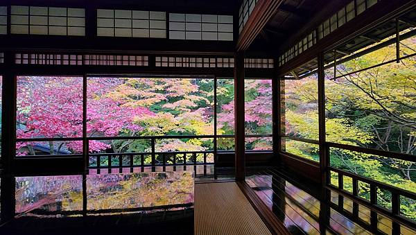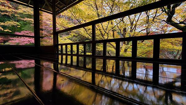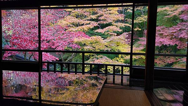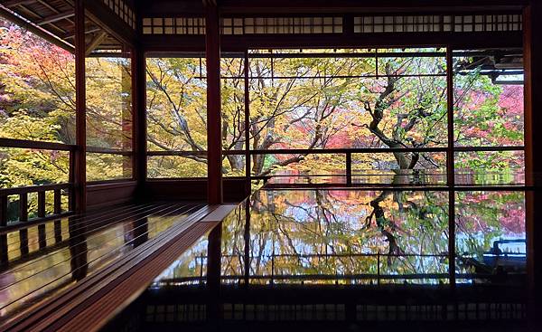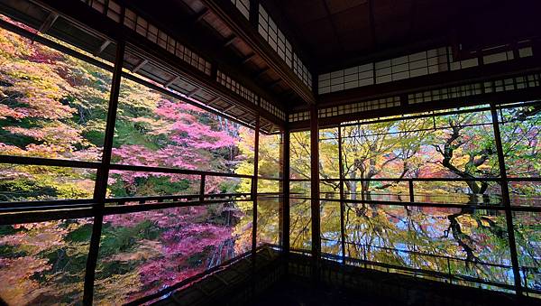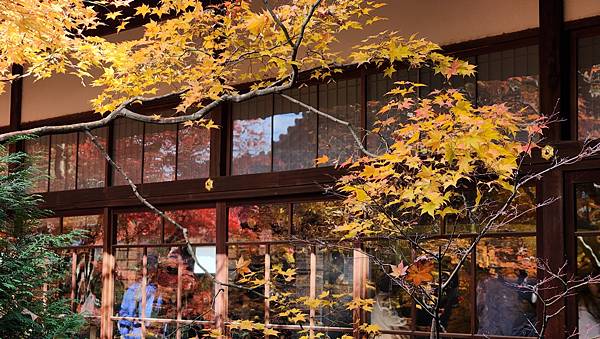 庭園中紅豔豔、黃澄澄的楓葉與窗格中的鏡影輝映成趣,令人目不暇給。
