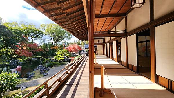 微雨方歇、和煦的陽光灑在和式長廊上,靜坐欣賞豐臣秀吉親自設計的日式庭園。