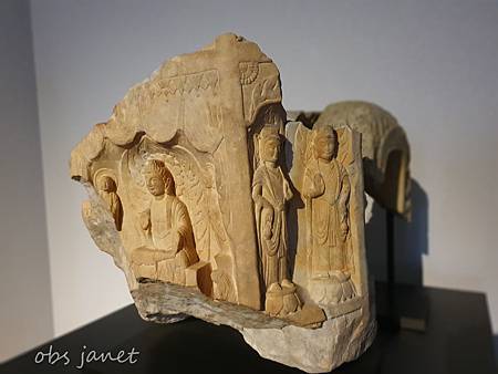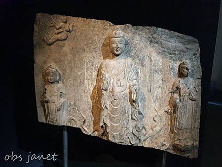 佛身背光成綻放式蓮瓣,身旁立有兩菩薩。