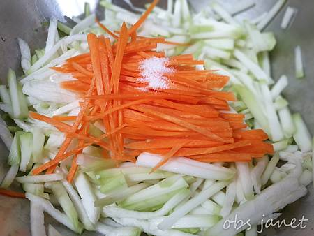 再將瓠仔和紅蘿蔔切成絲後加一匙鹽。