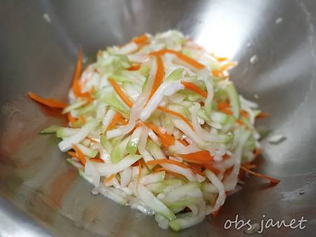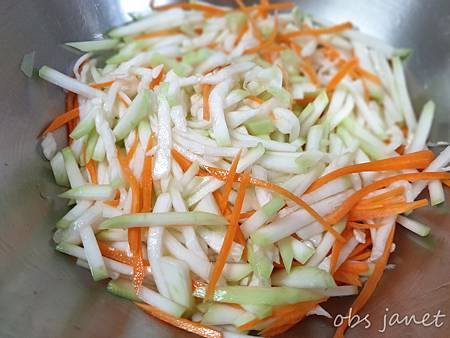 瓠仔絲和紅蘿蔔絲拌勻揉搓後靜置10分鐘待它出水。