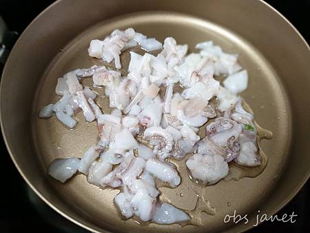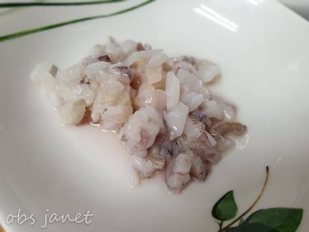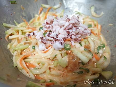 將煮熟的透抽丁加入瓠仔絲麵糊中。