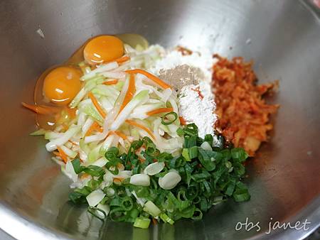在瓠仔絲裡面加適量麵粉、兩顆蛋、一點蔥花、些許韓式泡菜、少許白胡椒,和一大匙油,攪成麵糊。