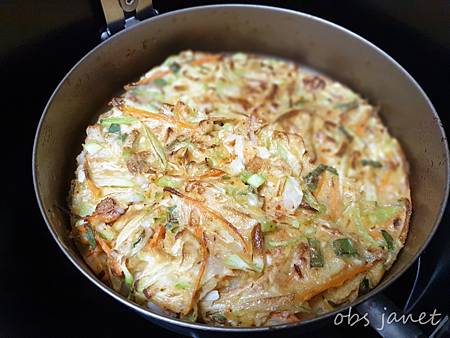 瓠仔絲麵糊放進煎盤中鋪平,上面噴一點油,用180度氣炸10分鐘烤熟,再用200度氣炸2分鐘烤酥。