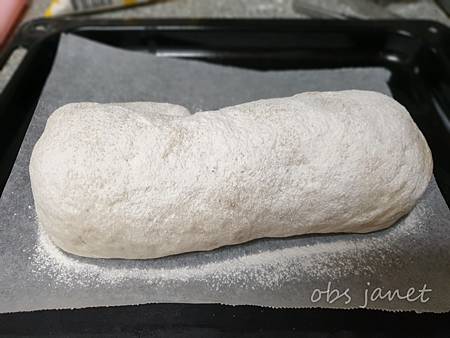 將麵團捲起,兩邊收口往內摺藏到下面,撒上一層麵粉,並用刀片在麵糰上畫上菱形線條。