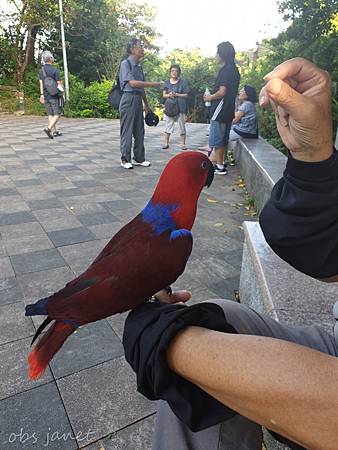 我們在幸福廣場巧遇一位溜鸚鵡的大哥,第一次看到紅色的鸚鵡,牠的毛色實在漂亮,忍不住上前搭訕,原來是『折衷鸚鵡』,上網查了一下,原來折衷鸚鵡公鳥母鳥都漂亮,只是雌雄顏色紅綠有別。