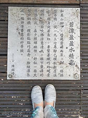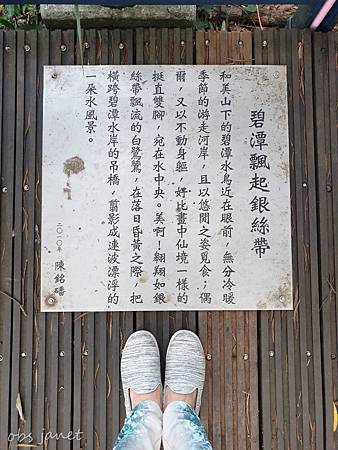 平臺棧板上有作家陳銘磻對於碧潭景物的描述,想必他經常到此一遊,且非常喜歡碧潭的景色。