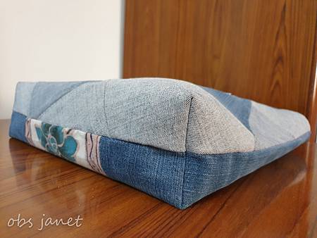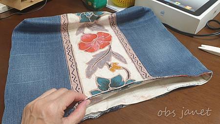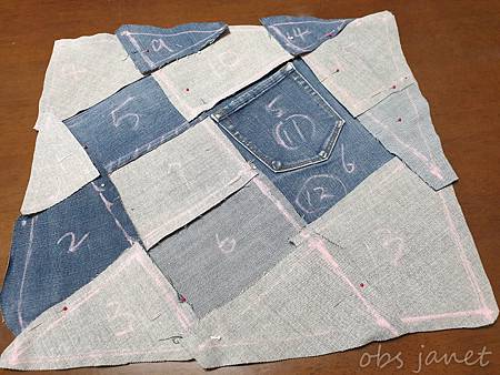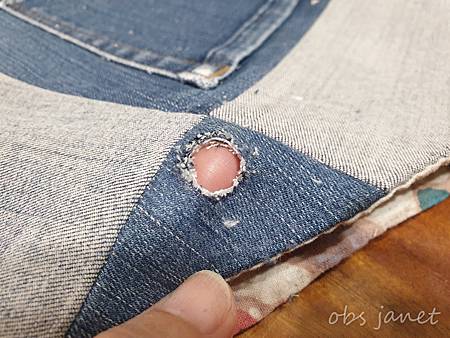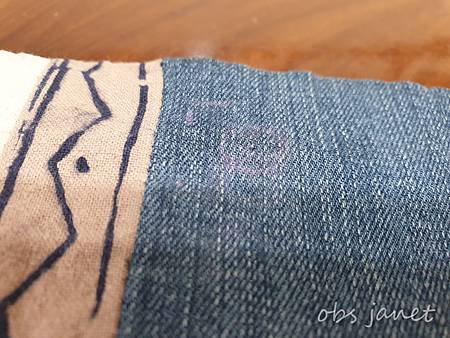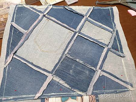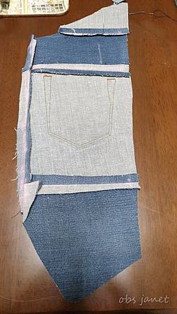 OJS的牛仔褲磨損嚴重,要避開破損的地方,沒辦法剪出大布片,表袋的另一面只能用拼接的方式。