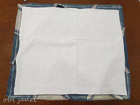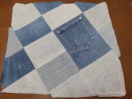 女兒的牛仔褲比較完整,可以剪出兩大片 ,再剪下桌巾一片,先試拼一下表袋正面的圖案與尺寸。