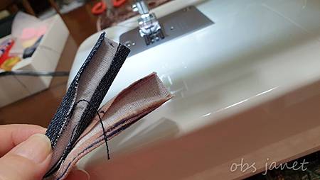帶子翻回正面,兩側車縫在一起,另一端也車縫好。