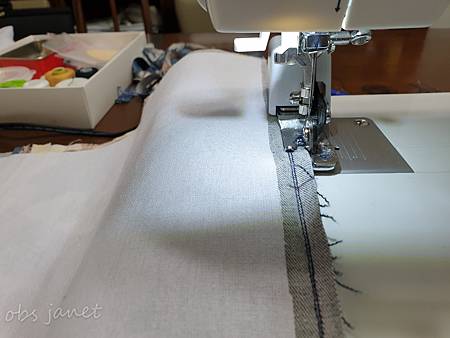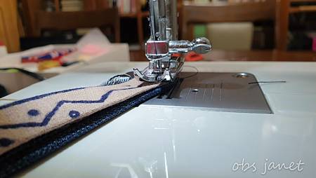表袋和裡袋都車好後,將縫紉機的壓布腳換成拷克器,四周車上布邊。
