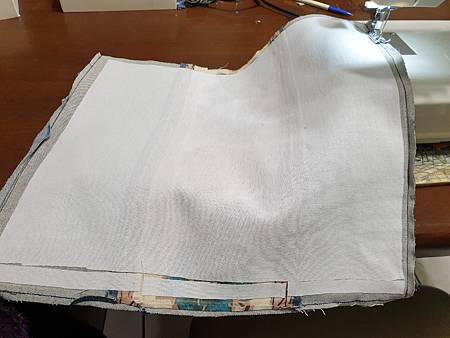 左、右、下三面車縫在一起後,兩側下方車出一個寬8公分的底(哎呀,忘了拍照),車出來的三角形剪掉。
