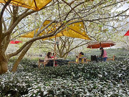 茶園主人很有創意,將李花和茶樹混種,在一排一排的茶樹中間舖上防草黑布,擺上桌椅,真是浪漫又愜意的用餐區。