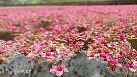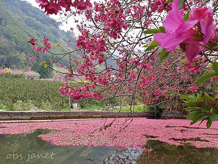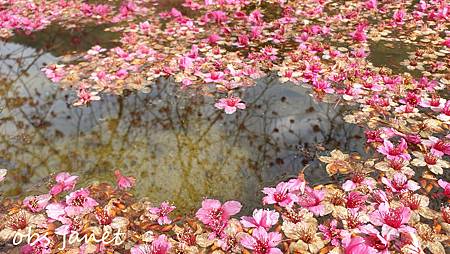 菜園邊灌溉的水池中落花與倒影也頗繽紛。