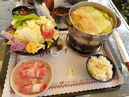 茶園小火鍋的肉片不是很優,不過湯頭很特別,是當地的筍片湯,菜盤裡的蔬菜很多樣,還有茶油拌飯,份量很足,蠻好吃的。