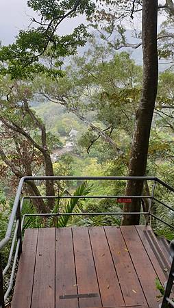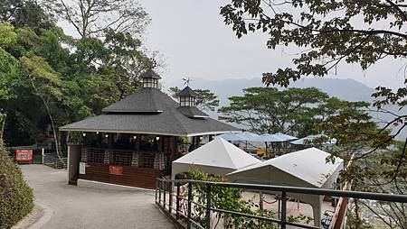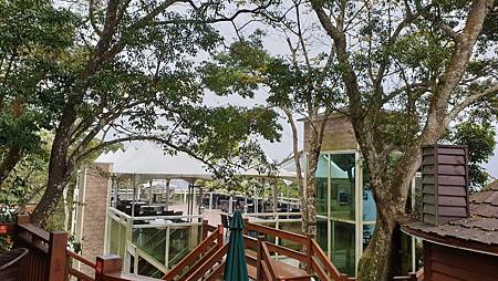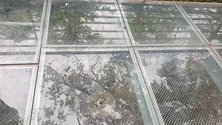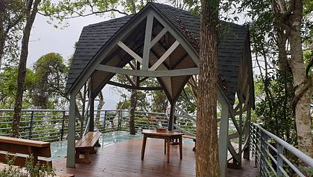造型典雅的觀景涼亭,視野不錯,地板的外圍是一圈透明玻璃,可以透視涼亭下方的樹梢。