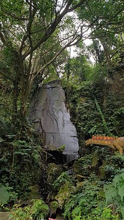 這兒原來應是瀑布奔流宣洩而下之處,可惜久旱無雨,徒留一片乾爽石壁。