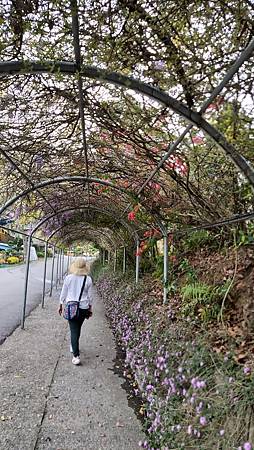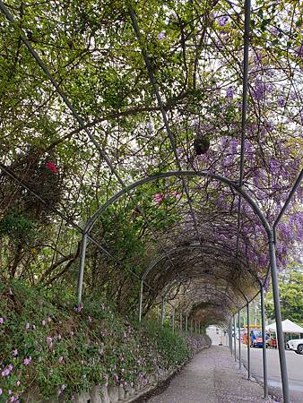 棚架上的紫藤雖未盛開,走在棚下卻有清淡宜人的花香,聞之賞心,望之悅目。
