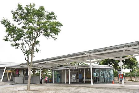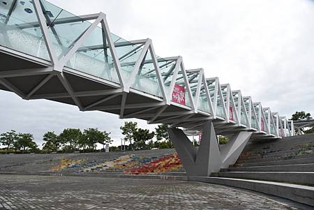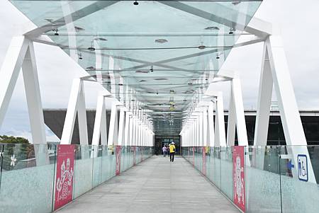 跨越活動廣場的人行天橋,連結園區入口與展覽館入口。