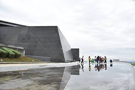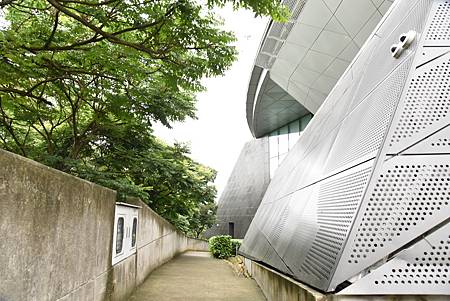 半月池旁有一通道可進入展覽館,多面向的帷幕外牆非常獨特。