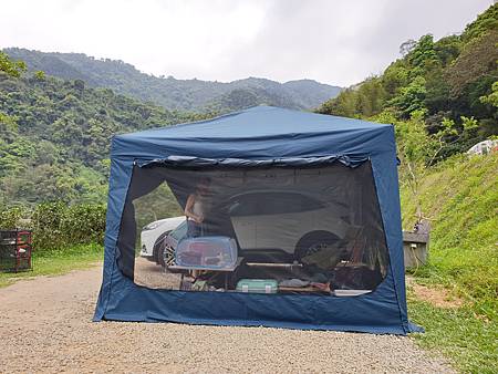 我們搭在A區,這次嘗試睡車上,OJS將客廳帳與車子用連接布接在一起。