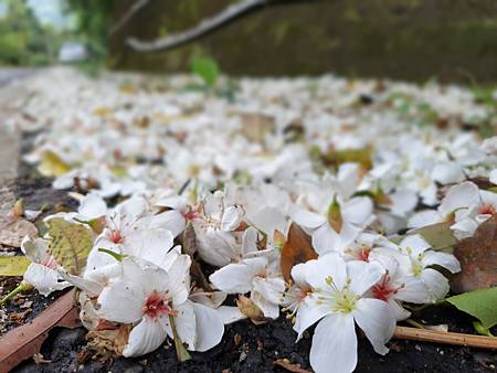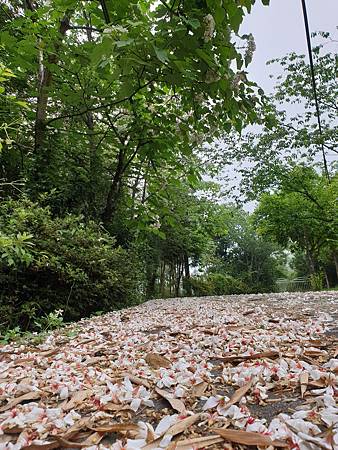 沿途有許多滿開的油桐花,很多路段的地面還有美麗的落花,時不時更可以看到朵朵油桐花從車子前方的馬路中央緩緩飄落下來。