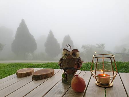 午後很快便起霧了,在濃濃霧景中將剛入手的IKEA燭台蠟燭、女兒出遊帶回來送爹娘的阿里山貓頭鷹、C區地上撿的水蜜桃在桌上隨意放置,是不是很有山林的氛圍呢?
