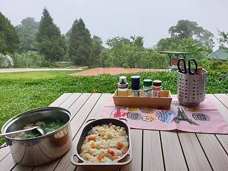 搭好帳後快速做好午餐,冷凍鮮蝦炒飯和餛飩湯,有飯有湯、有肉有海鮮,野外吃飯簡單,沒虧待自己。
