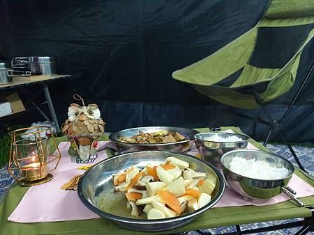 只有蛙鳴的營區內,兩個人的簡單晚餐。